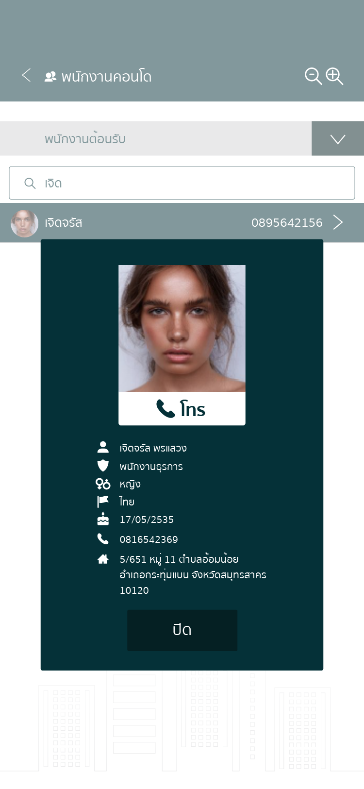 เป็นส่วนที่สามารถติดต่อและตรวจสอบข้อมูลของพนักงานประจำคอนโดผ่านแอปพลิเคชันได้